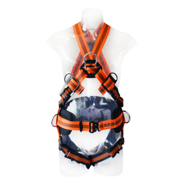 Arnés cuerpo completo cruzado con 4 puntos de conexión. Presillas para retener la cinta libre, refuerzo lumbar en cinta, hebillas de acople rápido para una fácil colocación, regulación en todas bandas. Toma frontal en hebilla y pierneras acolchadas. Ex código WXEHA12181