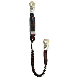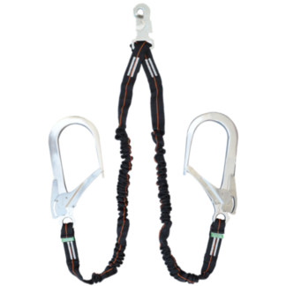 Cabo de vida anticaídas de 1,5 m en cinta de 45 mm, con amortiguador y mosquetones de 18 mm de abertura.