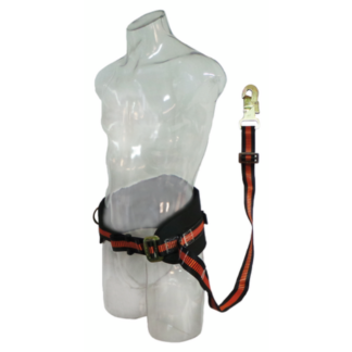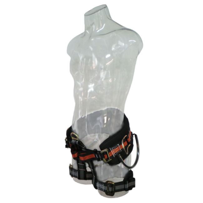 Cinturón con 3 puntos de conexión. Faja lumbar acolchada, hebillas con ranura para una fácil colocación, regulación en todas sus bandas, porta elementos laterales con protección en PVC y pierneras. Argolla de rescate y suspensión.