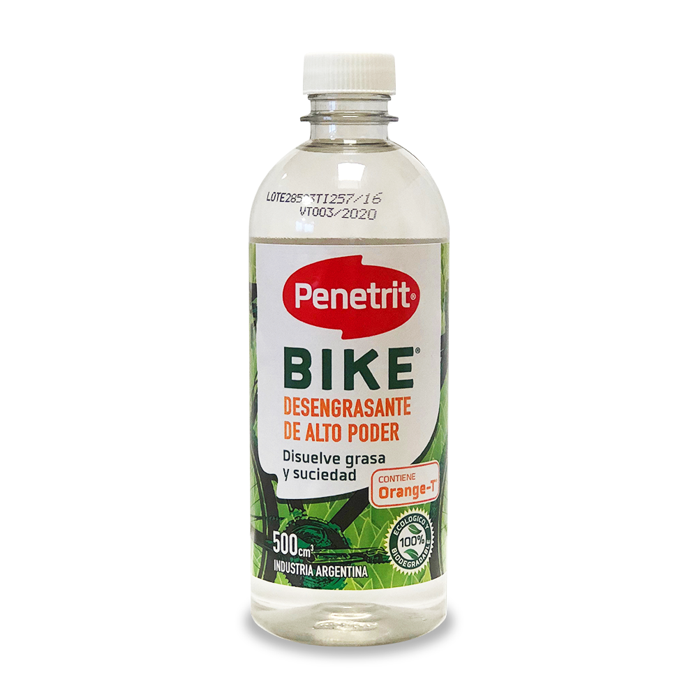 1) Colocar la bicicleta de forma que la cadena sea accesible fácilmente (soporte elevado o colocándola invertida sobre el piso). 2) Eliminar la suciedad gruesa de la cadena, plato, piñones y sistema de cambios. 3) Aplicar Penetrit Bike® Desengrasante de Alto Poder en toda la cadena, piñones, platos y sistema de marchas, y dejar actuar unos minutos. 4) Aplicar un cepillo o pincel suave sobre la cadena mientras se le da impulso con la pedalera, de modo tal de que el cepillo penetre en cada eslabón. Repetir este procedimiento con los piñones y los platos. Si la cantidad de suciedad o grasa fuera importante, se recomienda repetir la aplicación. 5) Mientras se aplica movimiento a la cadena, limpiar entre cada piñón para eliminar la grasa que ahí se deposita. Se recomienda realizar este procedimiento con la ayuda de una punta plástica, para no dañar los mecanismos. 6) Si fuera necesario, realizar una nueva aplicación del producto para barrer la suciedad remanente. 7) Eliminar todo el producto sobrante absorbiéndolo con un trapo seco y limpio, mientras se aplica movimiento a la cadena y demás sistemas con el pedal. 8) Dejar orear unos minutos y lubricar.