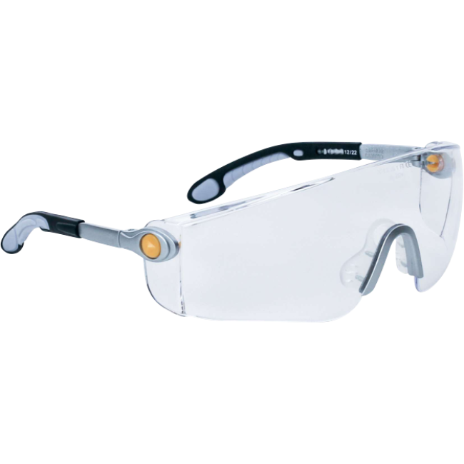 Gafas de policarbonato monobloque. Patillas nylon abatibles y ajustables. Conteras espatuladas. Puente nasal TPE flexible extra confort. Protecciones laterales.