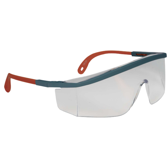 Gafas de policarbonato monobloque incoloro. Patillas nylon ajustables. Protecciones laterales.