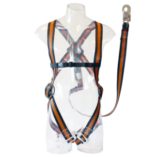 Arnés cuerpo completo con 3 puntos de conexión: dorsal y cintura. Presillas para retener la cinta libre, hebillas con ranura para una fácil colocación y regulación en piernas y cintura. Con cabo incorporado de 1,5m con absorbedor de energía.