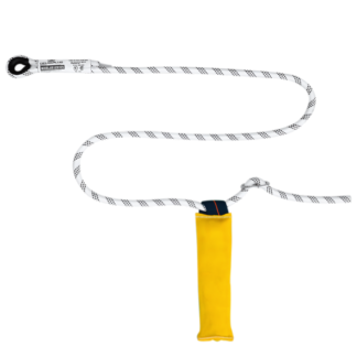 Línea de vida vertical en cuerda trenzada de Ø12,7 mm, con terminación en mosquetón de 55 mm de abertura. Incluye regulador y contrapeso.