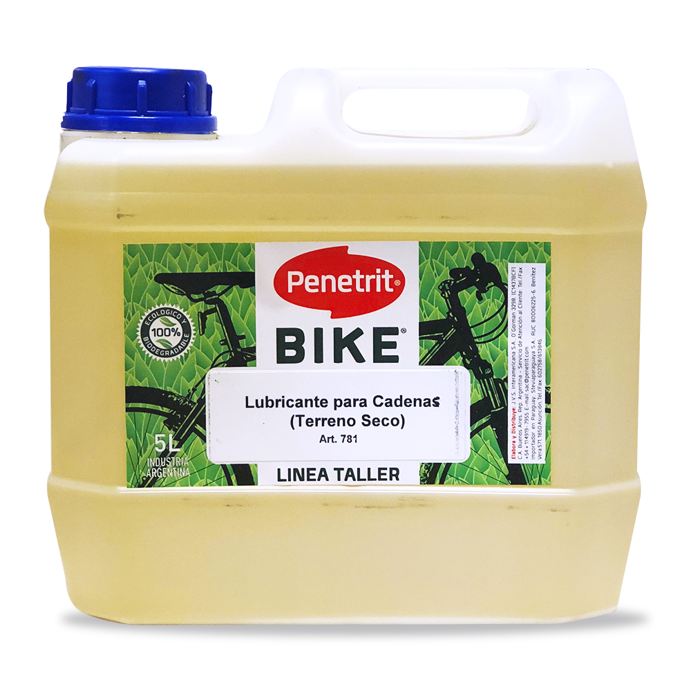 Lubricante ecológico a base de derivados vegetales y polímeros inertes que forman una película seca sobre la cadena protegiéndola contra la corrosión y el desgaste.