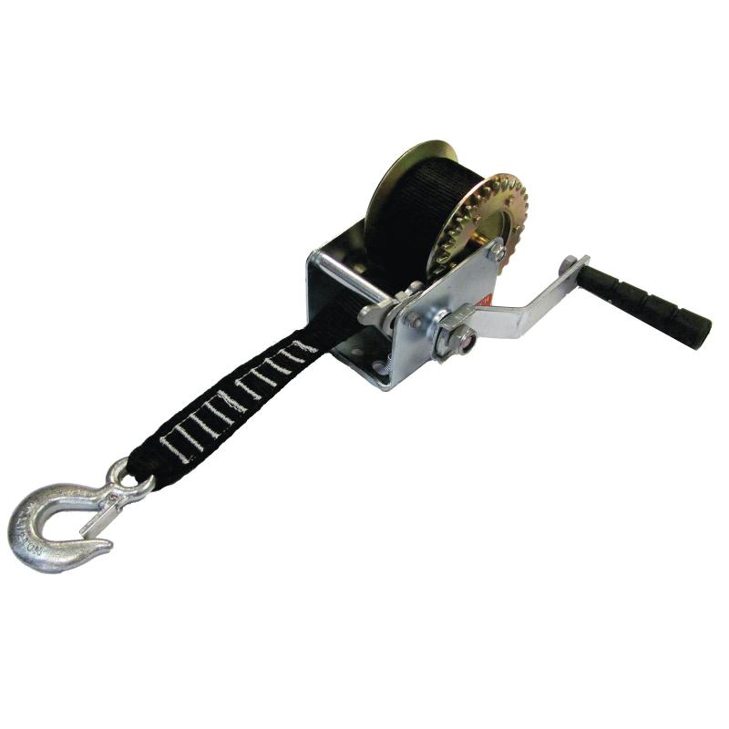 Malacate manual de anclaje fijo, en cinta de 40 mm de ancho. Carga máxima de trabajo 250 kg.