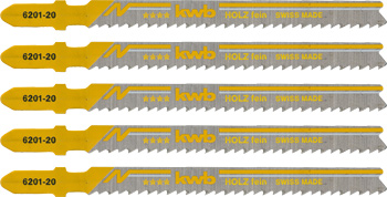 Hojas de sierra de calar, HCS, templadas, dentadas en cruz, rectificadas cónicas y en ángulo libre, cortes rápidos y limpios, con diente de inmersión, para un calado sin problemas, para madera, madera dura, tableros de virutas, tableros de aglomerado y tableros de fibra, tableros plastificados, plásticos blandos y plásticos reforzados con fibra de vidrio.