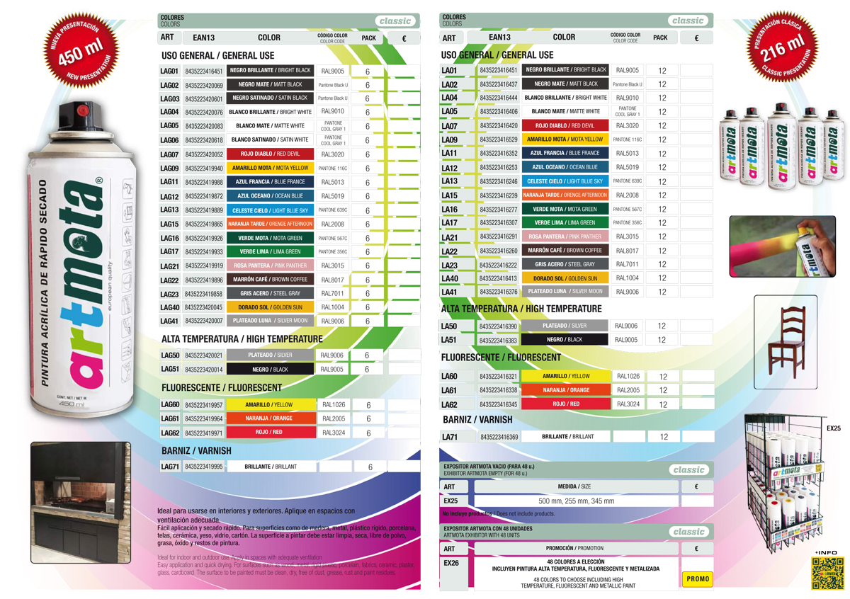 25 COLORES, USO INTERIOR Y EXTERIOR. PARA MÚLTIPLES SUPERFICIES: MADERA, METAL,ACERO INOXIDABLE, VIDRIO, YESO, HORMIGÓN, CERÁMICA, ETC.