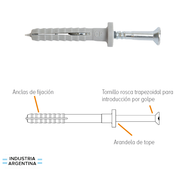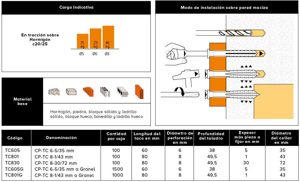 El TC es un tarugo de nylon de expansión por golpe para fijaciones ligeras en materiales macizos. Es un taco ideal para el montaje a través y se suministra con el tornillo premontado, lo que provoca una notable disminución en el tiempo de colocación. El tornillo tiene rosca tipo diente de sierra lo que favorece la penetración a golpes y ofrece sencillez para el desatornillado.